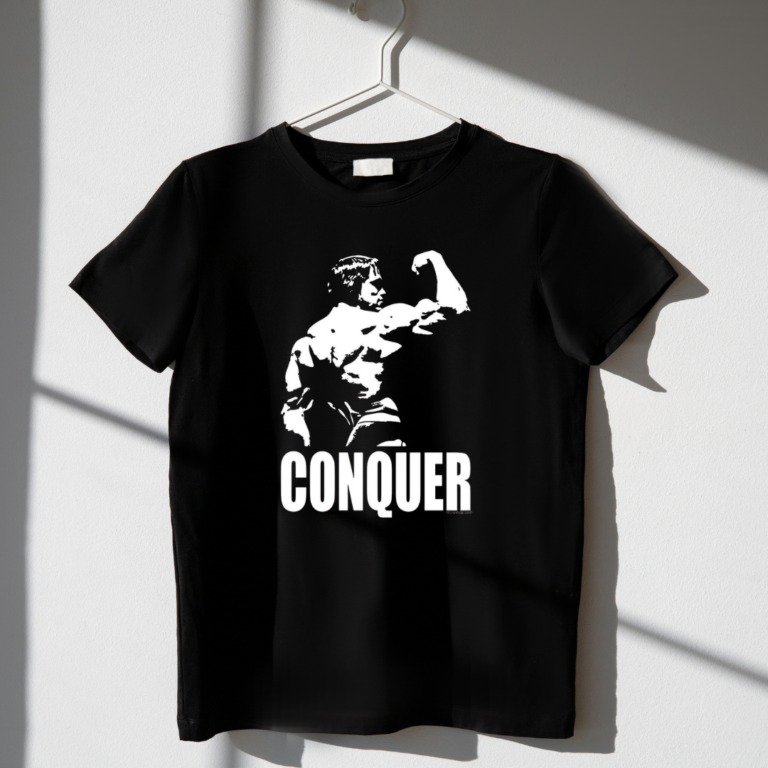 Legends aren’t born — they’re built, one rep at a time. The Conquer Tee is your daily reminder to rise above the noise, crush the excuses, and own every set like it’s your stage. Featuring a bold, throwback silhouette of a classic bodybuilder in peak form, this tee is for lifters who treat the gym like a battlefield.